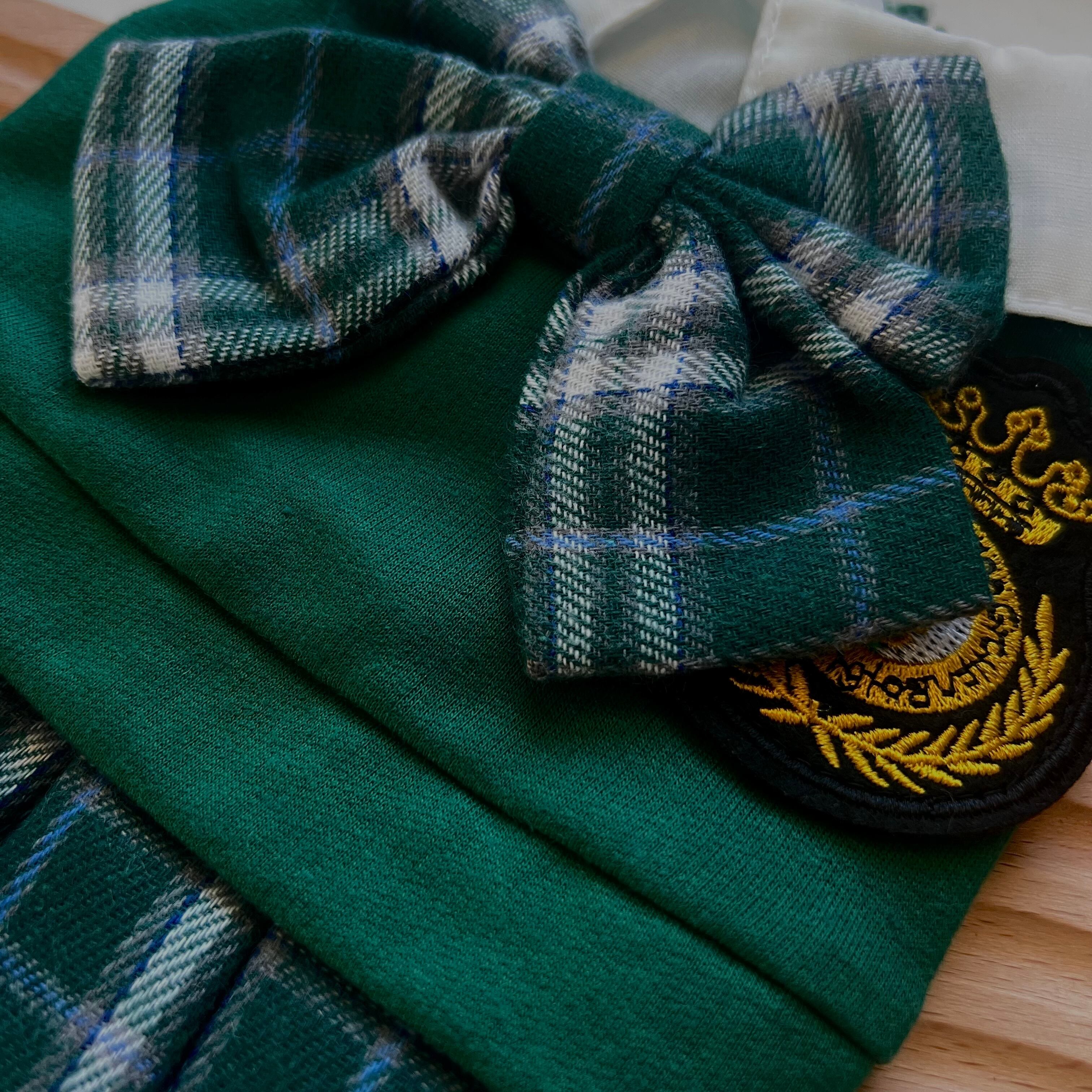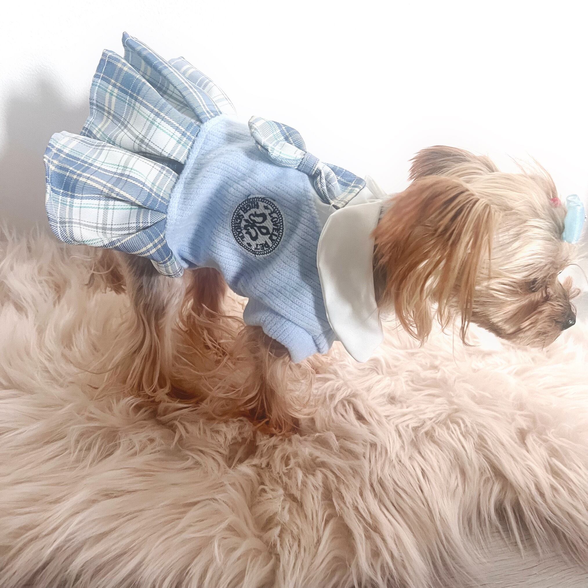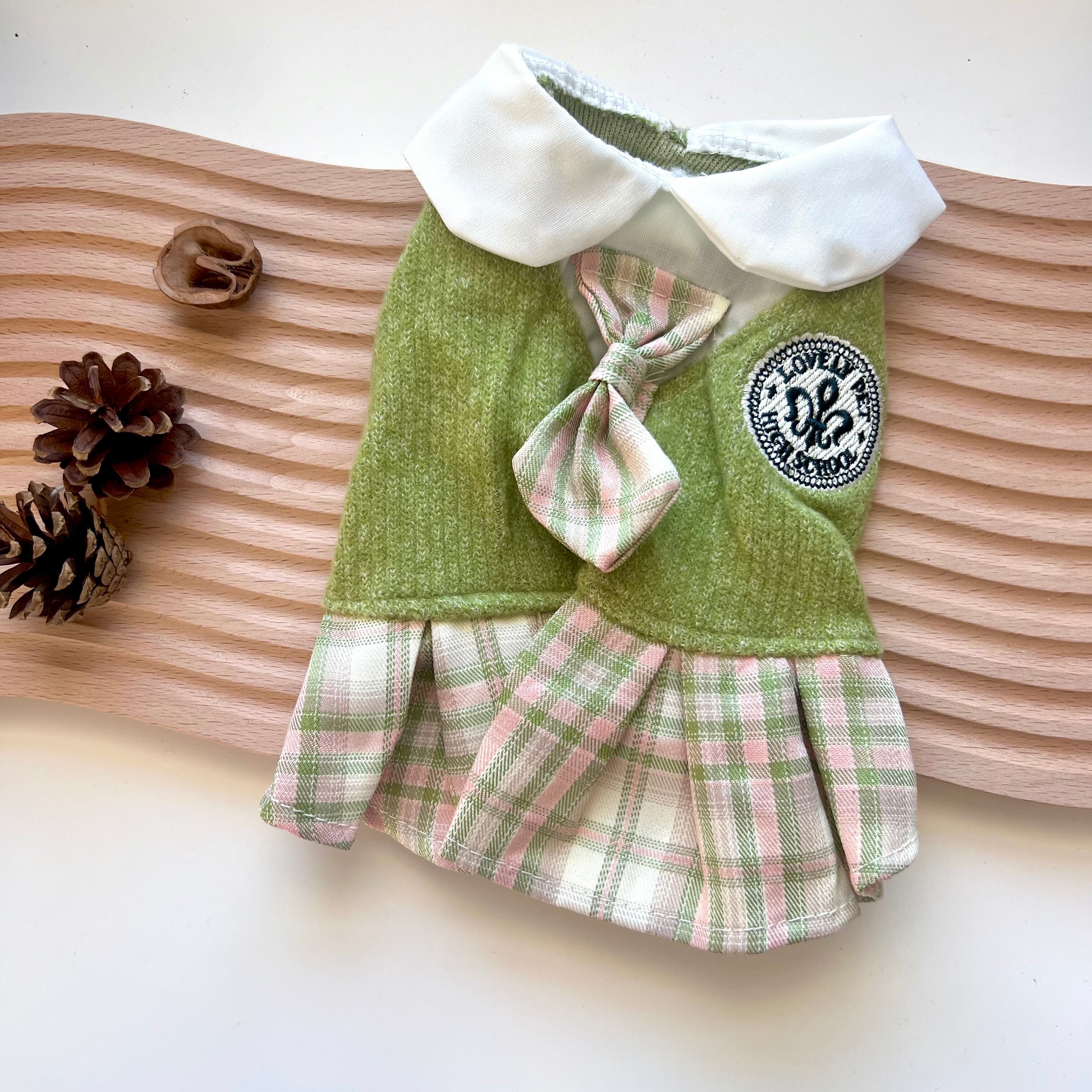 わんちゃんも学校に通っているような気分が味わえる、スクールガールワンピースのご紹介です。チェック柄スカートと白ブラウスのワンピースは、まさに学生の制服を思わせるデザインで可愛らしいです。