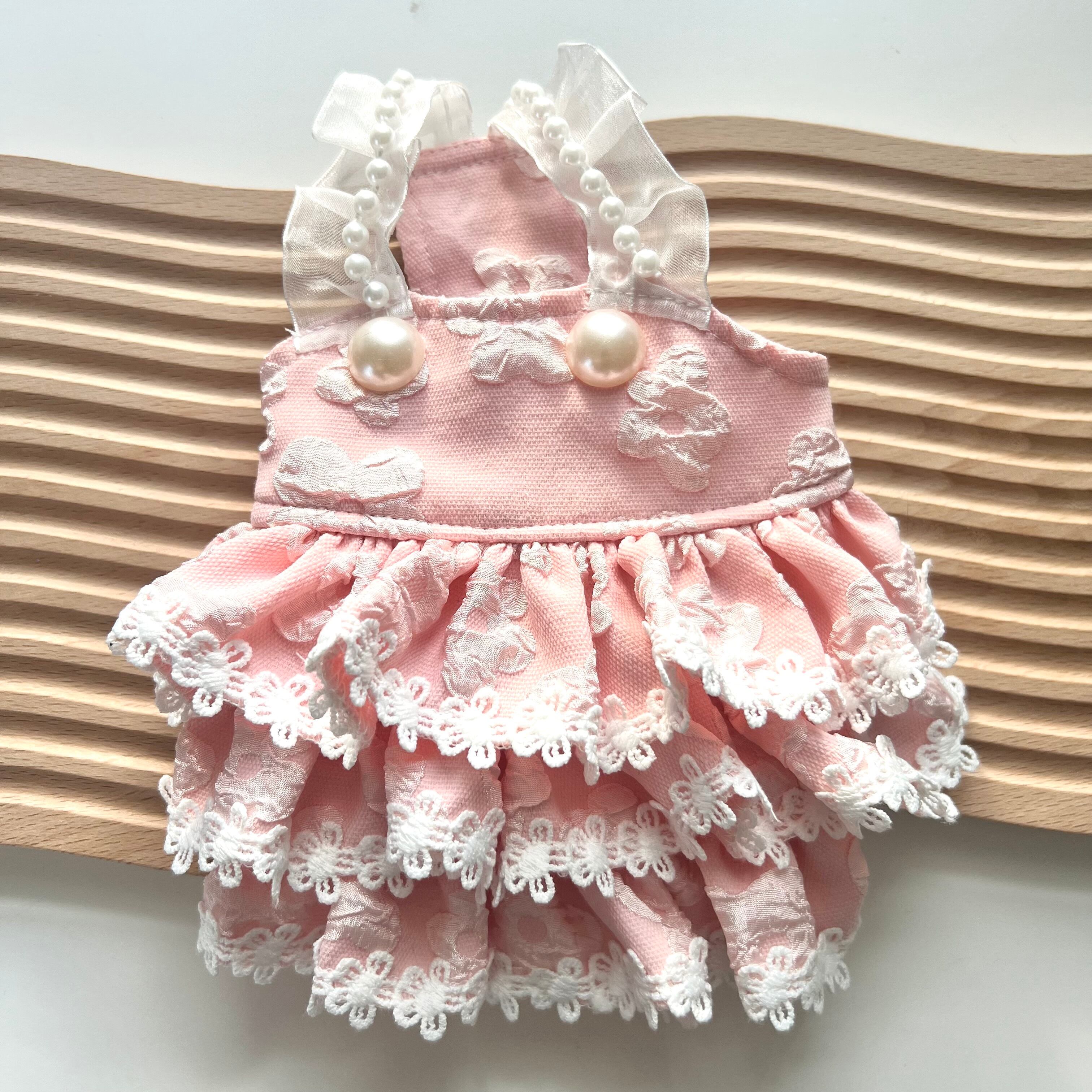 キャミのストラップに小さなパール、大きなパールも胸と背中に付いたきれいめキャミワンピース、ケーキのようなワンピースです
